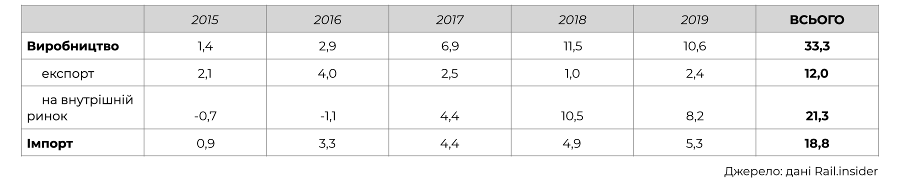 Так за останні 5 років у системі українських залізниць було зареєстровано 40,1 тис. нових вантажних вагонів, з яких майже кожен другий вагон був ввезений з Росії (див. табл.). Ідеться виключно про ввезення списаних вагонів, у яких нормативний термін експлуатації сплив. У Росії, як і в більшості країн СНД, такі вагони для експлуатації заборонені, а в Україні – ні.
